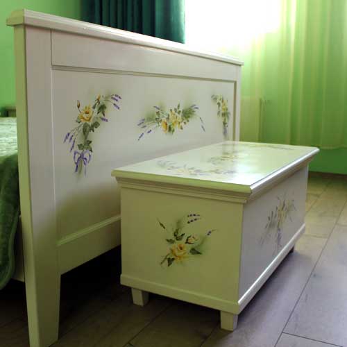 Comoda cu trei sertare, pictata manual, realizata din lemn masiv, cu feronerie antichizata, sine glisante cu extracţie totala sau clasice. Mobilierul este realizat cu metode tradiţionale si finisaj manual care îmbina frumuseţea, rezistenta si confortul.
